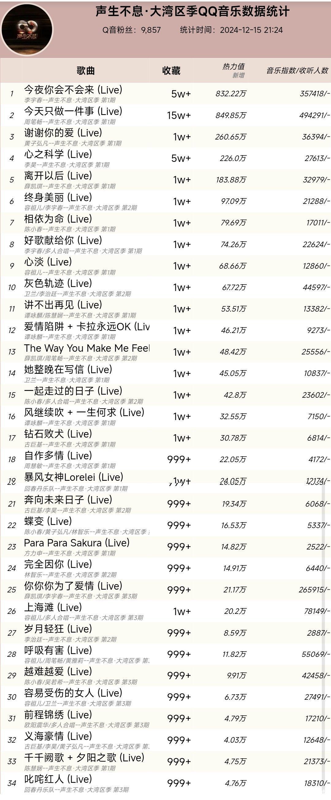 歌曲的热力值是832.2万收藏量是15万音源数据超越了李宇春在第一期演唱的《今夜你会不会来》。